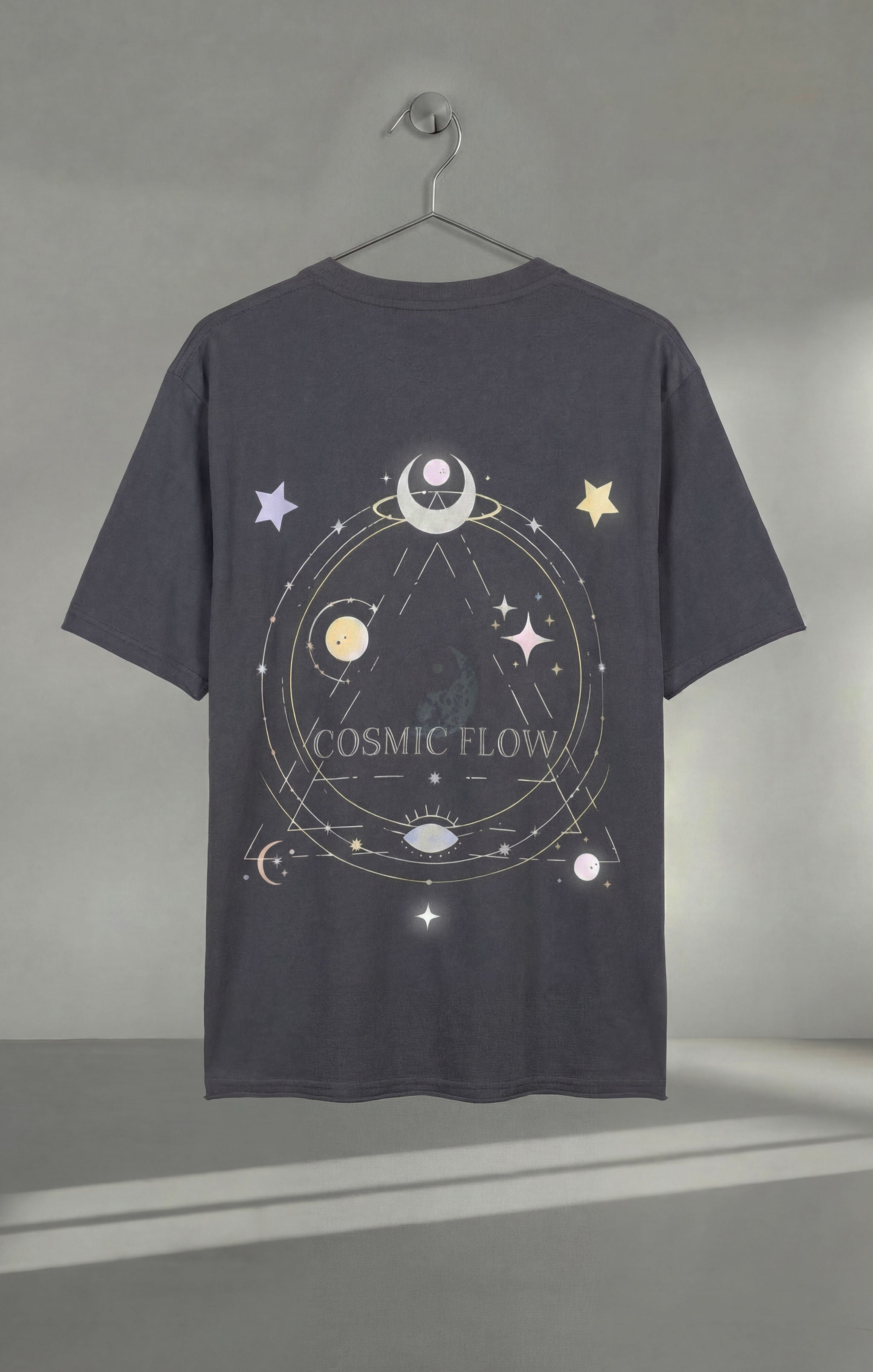 Unser nachhaltig produziertes Damen Yoga Boxy T-Shirt Sora in dunklem Anthrazit erhält mit dem großen Cosmic Flow Backprint ein kraftvolles und spirituelles Upgrade. Der pastellig-bunte Print mit schimmernden silbernen Details symbolisiert Balance, Harmonie und den Fluss universeller Energie. Cosmic Flow steht für das Einssein mit dem eigenen Rhythmus, das fließende Zusammenspiel von Körper, Geist und Seele sowie die Verbindung mit dem kosmischen Energiefluss. Der Print vermittelt die Botschaft von Kraft, Achtsamkeit, Leichtigkeit und innerem Strahlen – ein Statement-Piece für alle, die bewusst, energiegeladen und im Flow des Lebens bleiben wollen.